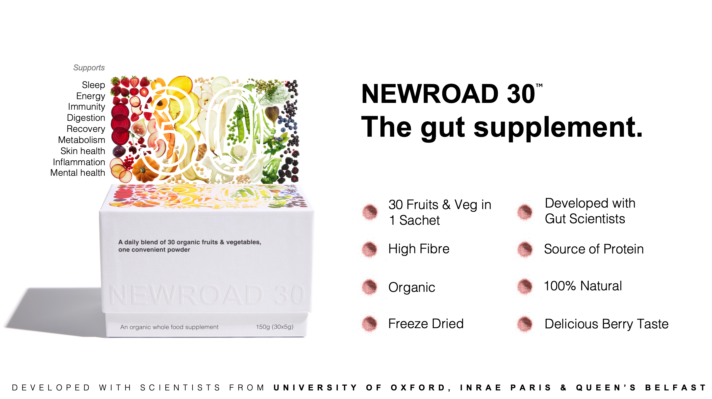 NEWROAD 30 is the only pure food solution containing 30 different organic fruits, vegetables and pulses and nothing else. Inspired by the gut microbiome revolution, NR30 is a delicious whole-food powder blend with a natural berry taste. Freeze-dried to preserve maximum potency and nutrients, delivering a concentrated form that’s as close to fresh as it gets. High in fibre and polyphenols, nutrients naturally linked with supporting a balanced diet and gut microbiome diversity. Created in Oxford, driven by science.