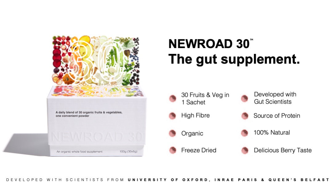 NEWROAD 30 is the only pure food solution containing 30 different organic fruits, vegetables and pulses and nothing else. Inspired by the gut microbiome revolution, NR30 is a delicious whole-food powder blend with a natural berry taste. Freeze-dried to preserve maximum potency and nutrients, delivering a concentrated form that’s as close to fresh as it gets. High in fibre and polyphenols, nutrients naturally linked with supporting a balanced diet and gut microbiome diversity. Created in Oxford, driven by science.